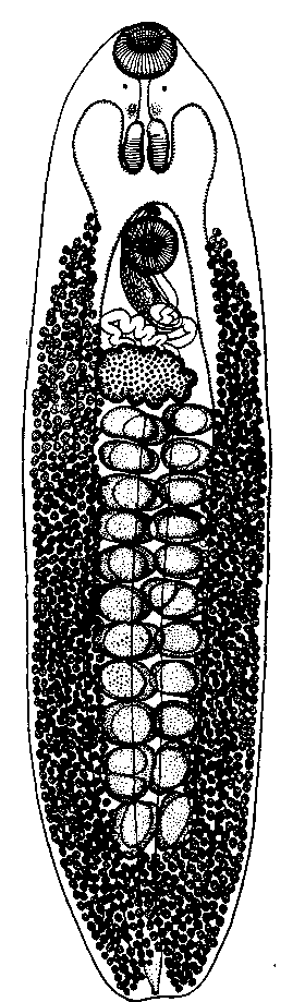 Семяприемника нет. Тельце Мелиса расположено дорзально от яичника. При полном развитии матки, ее петли занимают почти все пространство между кишечными стволами от брюшной присоски до поперечных желточных протоков, проходящих дорзально от яичника, непосредственно впереди передних семенников. Метратерм извилистый, ясно выраженный, окружен многочисленными клетками; он лежит дорзально от брюшной присоски и входит в половой атриум вместе с циррусом. Яйца овальные, с тонкой оболочкой и сегментированным содержимым, достигают 0,069— 0,072 мм длины при ширине 0,033 мм. Мелкие желточные фолликулы окружают со всех сторон кишечные стволы; они начинаются от уровня полового отверстия и доходят до заднего конца тела.