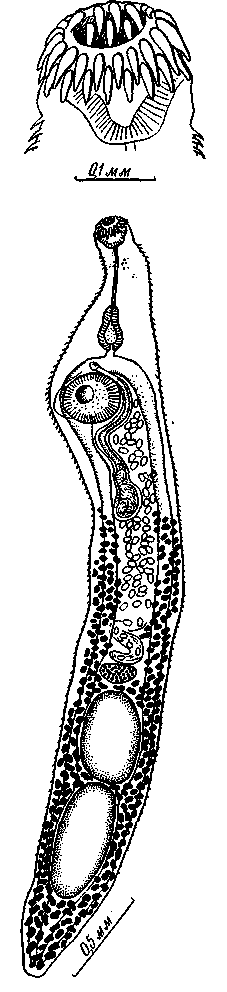 Ротовая присоска сильно варьирует в отношении формы и размера. Иногда она представляется в виде плоской чаши с широким ртом; в других случаях бывает глубже, но со сравнительно узким ротовым отверстием. Диаметр ее 0,15—0,27 мм, в среднем 0,21 мм. Размер шаровидной брюшной присоски гораздо более постоянен; ее средний диаметр равен 0,27 мм. Таким образом, соотношение присосок равно 7 : 9.