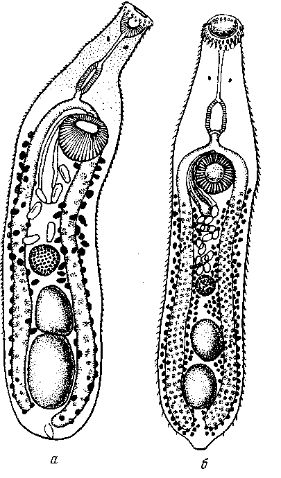 Stephanostomum baccatum (Nicoll, 1907) (a — по Мантёру, 1926; б — по Николлю, 1913)