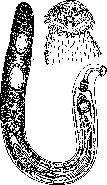 Вокруг головного конца расположены 34 головных шипа, образуя с дорзальной стороны два чередующихся ряда, а вентрально и латерально— один ряд. Шипы дорзальных рядов несколько крупнее остальных и достигают 0,057—0,061X0,015—0,019 мм, тогда как латеральные и вентральные головные шипы 0,045—0,05X0,015—0,019 мм. Воронковидная твальная присоска 0,12—0,14X0,22—0,3 мм, направлена вперед и вооружена упоминавшимися выше шипами. Префаринкс достигает 0,5—0,6 мм длины, а овальный фаринкс 0,22—0,28X0,2—0,22 мм. Пищевод чрезвычайно короткий и у сократившихся экземпляров едва заметен. Длинные, простые кишечные стволы впадают у заднего конца тела в латеральные стороны экскреторного пузыря вблизи его наружного отверстия. Брюшная присоска, достигающая около 0,34 мм в диаметре, расположена приблизительно на середине передней трети длины тела.