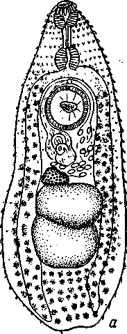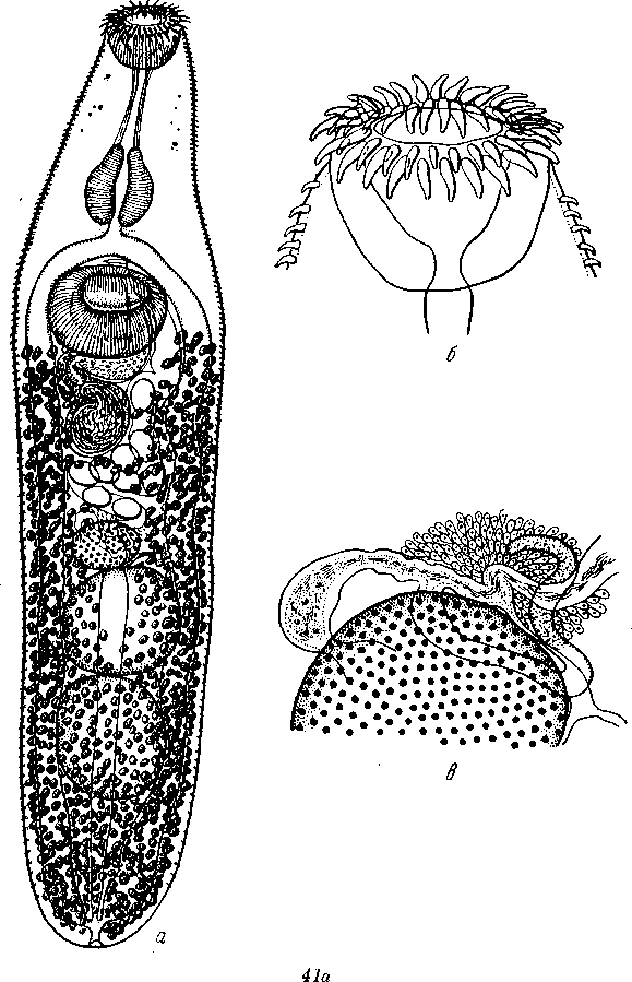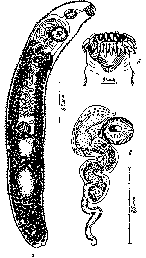 a — марита; б — шипы вокруг рта; в — концевой половой аппарат
