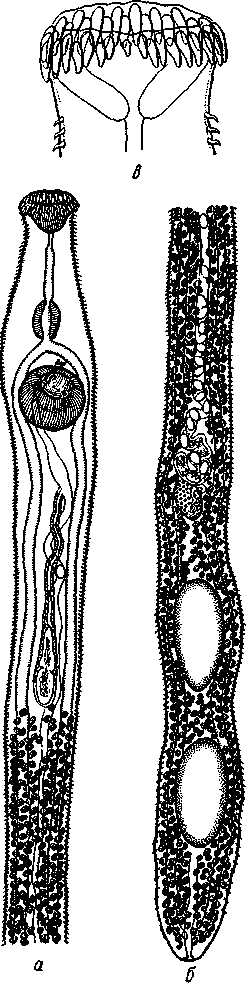 a — передний конец; б — задний конец, в — шипы вокруг рта