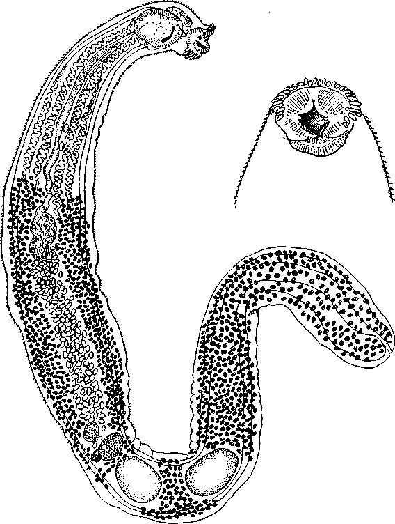 Марита и вооружение рта отдел, занимающий несколько более средней трети, и тонкий, покрытый шипами циррус, который соединяется с метратермом на небольшом расстоянии позади брюшной присоски. Овальный яичник, ширина которого больше длины, отделен от переднего семенника несколькими желточными фолликулами. Имеется семяприемник.