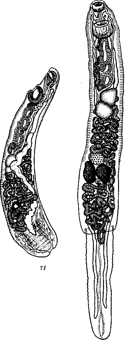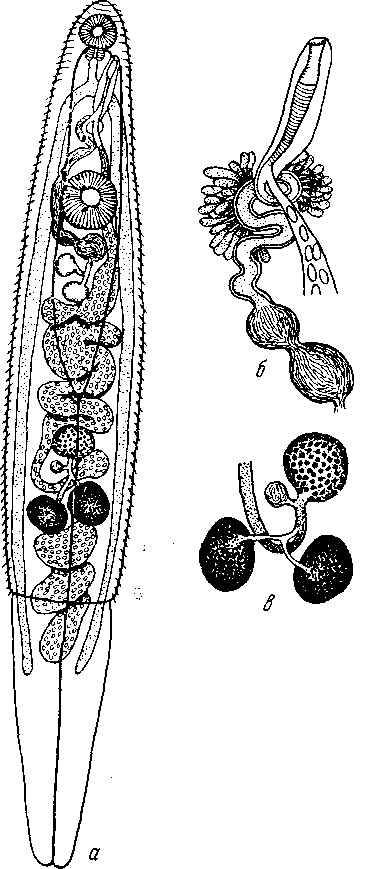 а - общий вид; 6 - концевой половой аппарат; в — положение женских половых органов