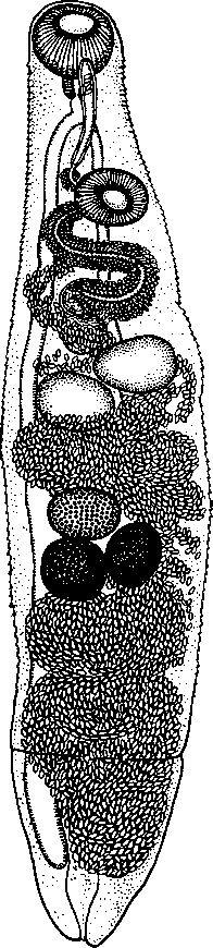 Поперечно-овальные семенники расположены наискось один за другим, в передней части средней трети тела; диаметр переднего семенника 0,137x0,22 мм, диаметр заднего 0,147x0,23 мм. Семенной пузырек продольный, ясно разделен на переднюю и заднюю часть; передняя достигает 0,1 мм длины и 0,12 мм ширины и имеет тонкую мышечную стенку, а задняя несколько меньшего размера и расположена слегка вентраль-но по отношению к передней. Длинная, змеевидная простатическая часть соединяется с маткой непосредственно перед передним краем брюшной присоски и образует длинный, мышечный гермафродитный проток, открывающийся на вентральной стороне ротовой присоски.