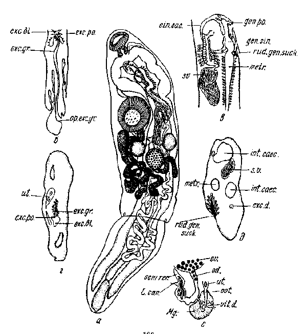 Обозначения: ехс. bl.— экскреторный пузырь; exc. d. — экскреторный ствол; exc. gr.— экскреторный желобок; ехс. ро. — экскреторное отверстие; gen. ро.— половое отверстие; gen. sin.— гермафродитный проток; int. саес.— кишечный ствол; L. can.— лауреров канал; M. g. — тельце Мелиса; metr.— метратерм; od. — яйцевод; oot.— оотип; ор. ехс. gr.— отверстие экскреторного желобка; ov.— яичник; rud. gen. suck.— рудиментарная половая присоска; sem. rec.— семяприемник; sv.— семенной пузырек; sin. sac.— гермафродитная бурса; ut.— матка; vit. d.— желточный проток