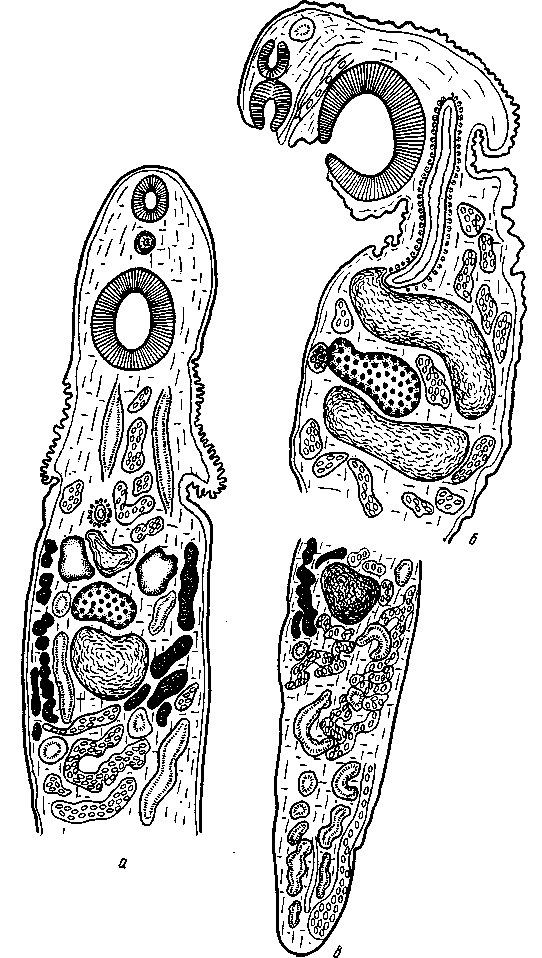 a — фронтальный срез через передний конец тела; б — сагиттальный срез через передний конец тела; в — фронтальный срез через задний конец тела