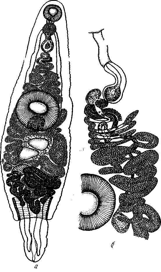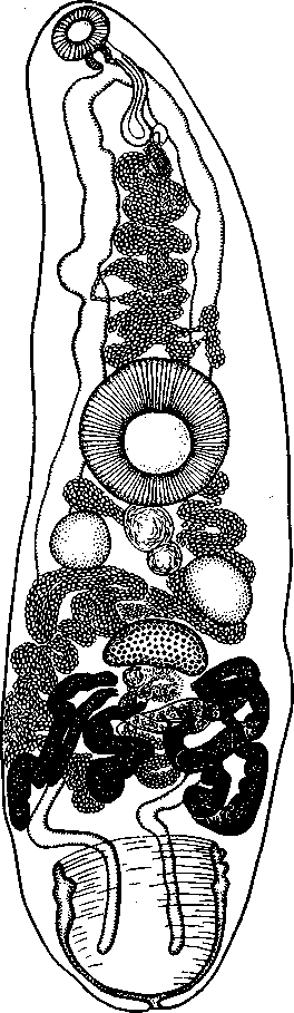 Извитые кишечные стволы простираются почти до заднего конца хвостового придатка. Брюшная присоска круглая, 0,5 мм в диаметре, лежит в передней части средней трети тела. Овальные семенники 0,18—0,21x0,21—0,23 мм в диаметре, лежат наискось один за другим в задней половине средней трети тела и отделены друг от друга семенным пузырьком и петлями матки. Удлиненноовальный семенной пузырек состоит из двух неравных частей, лежит непосредственно позади брюшной присоски; его размер 0,26x0,14 мм.