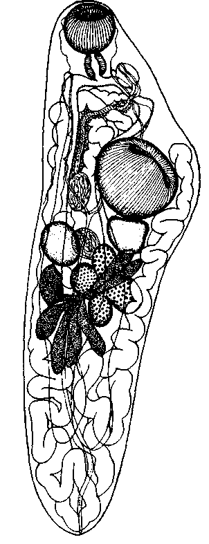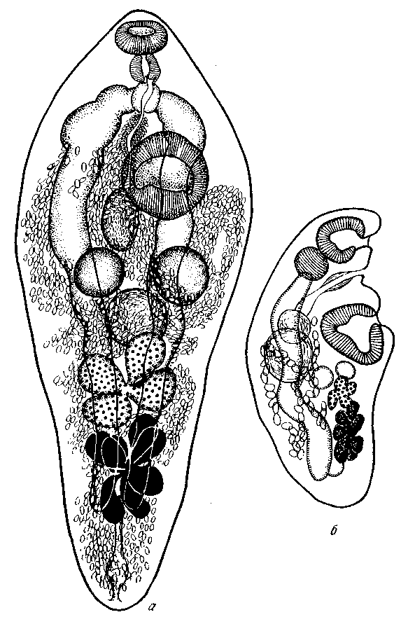 Lecithaster salmonis Yamaguti, 1934 (a — по Ямагути, 1934; 6 — по Ллойду, 1938)