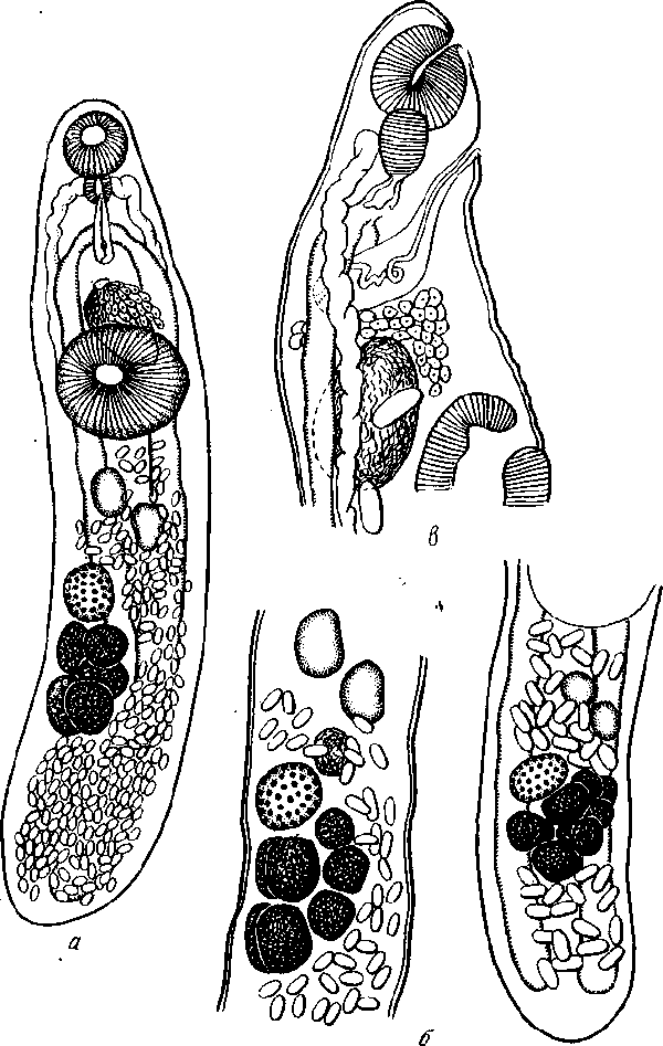 a — общий вид; б — детали внутренних органов; в — передний конец тела
