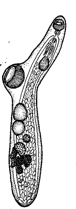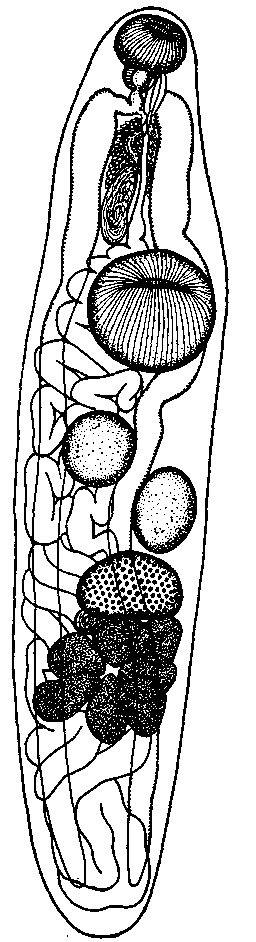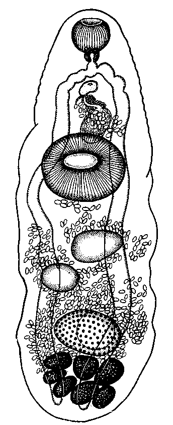 Желточник состоит из семи фолликулов, размером 0,038—0,09x0,03— 0,06 мм каждый, расположен сейчас же позади яичника. Матка содержит большое количество яиц размером 0,022x0,01—0,015 мм; она занимает пространство между кишечными стволами, начиная с заднего конца семенного пузырька до конца тела. Дистальная часть матки проходит с левой стороны простатической части. Экскреторный пузырь Y-образный; латеральные каналы соединяются на дорзальной стороне у ротовой присоски.