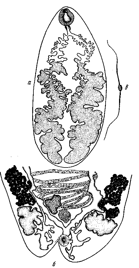 a — пищеварительная система; 6 — анатомия заднего конца тела; в — яйцо с филаментами