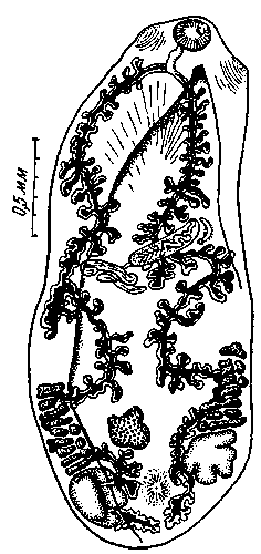 Фаринкса нет; пищевод тонкий. Кишечные стволы тянутся до заднего конца тела, образуя по всей своей длине многочисленные короткие дивертикулы. Половое отверстие лежит на левом крае тела, приблизительно на расстоянии одной трети от переднего конца тела. Половая бурса относительно крупная, цилиндрическая, причем ее проксимальный отдел представлен простатической частью. Семенной пузырек имеет вид скрученной трубки, лежит позади основания половой бурсы и входит в дистальный конец простатической части.
