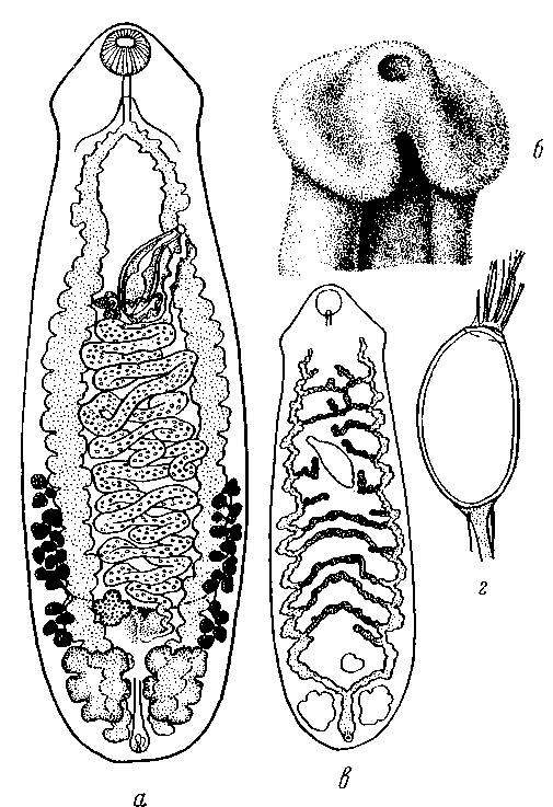 а — марита; б — головной конец; е — экскреторная система; г — яйцо