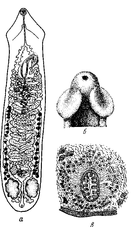 а — марита; б — головной конец; в — экскреторный канал (срез)