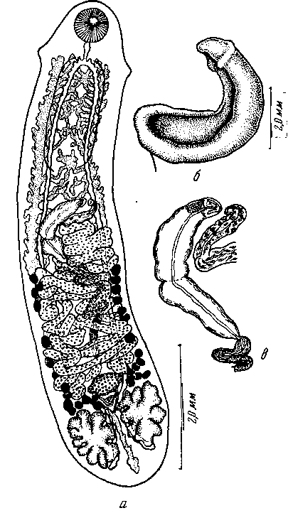 а — марита; б — внешний вид мариты; в — концевой аппарат половой системы