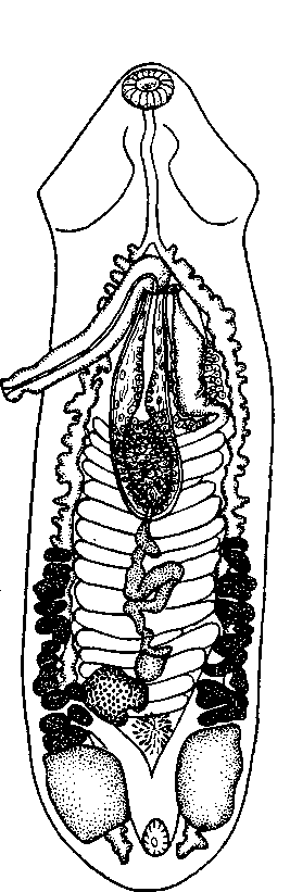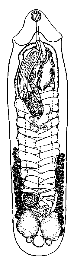 Они простираются от уровня середины семенников до заднего конца семенного пузырька. Довольно толстые петли матки обычно не выходят за пределы наружных краев кишечных стволов, но единичные петли могут заходить кнаружи от них. Очень толстый метратерм равен длине цирруса, т. е. достигает 0,48 мм; он окружен многочисленными железистыми клетками.
