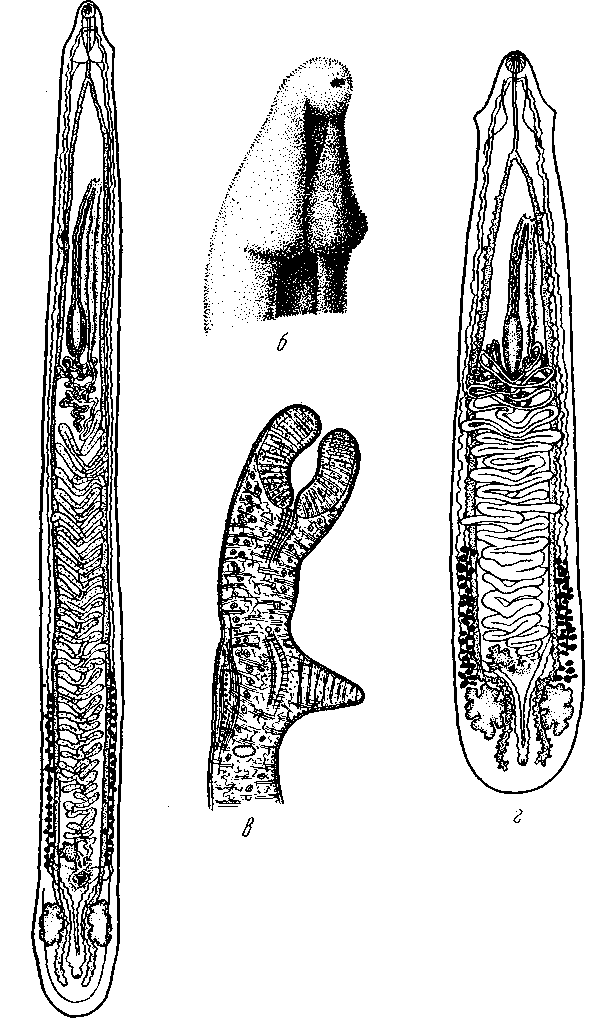 а - марита в вытянутом состоянии; б — головной конец; в— срез головного конца; г — марита в состоянии сокращения