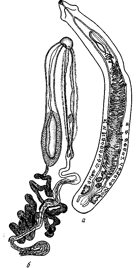 Присоска слегка удлинена, достигает у крупных экземпляров 0,17 X 0,12 мм, а у более мелких — соответственно меньше. Пищевод относительно длинный и очень тонкий; на уровне заднего края латеральных лопастей пищевод разделяется на два кишечных ствола, которые тянутся по прямой линии до семенников, где заворачивают, как обычно, к медианной линии; возле экскреторного отверстия лежат их сближенные между собой концы, У вытянутых экземпляров стенки кишечных стволов на всем протяжении почти совершенно гладки и лишь позади семенников слегка волнисты. Наоборот, у сильно сократившихся экземпляров наружные края кишечных стволов образуют более или менее сильные извивы, иногда производящие впечатление маленьких латеральных ветвей; в этом случае и позади семенников волнистость выражена гораздо более резко.