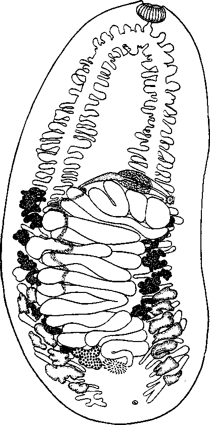 Семенники состоят из 14—15 фолликулов, занимающих заднюю треть длины тела и расположенных на вентральной стороне задней части обоих кишечных стволов. Задние концы правого и левого рядов семенников соединяются на небольшом расстоянии от заднего конца тела, образуя форму открытой вперед подковы.