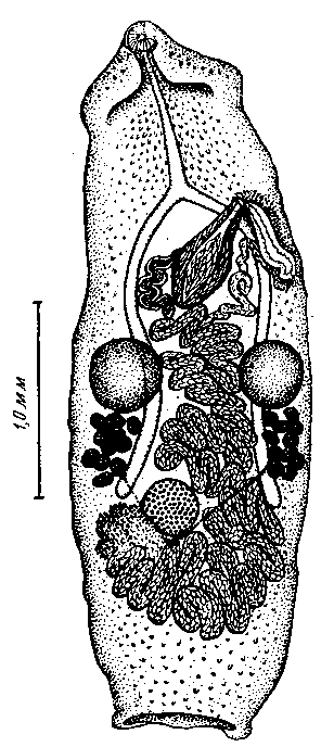 Семенники расположены симметрично, по бокам тела впереди яичника,, кнаружи от кишечных стволов, приблизительно на середине или, скорее, впереди середины длины тела, на расстоянии 0,9—1 мм от переднего конца и 1,04—1,07 мм от заднего; они полушаровидные, несколько овальные или грушевидные, занимают почти все пространство между кишечными стволами и стенками тела, достигая 0,35—0,46 X 0,28—0,40 мм.