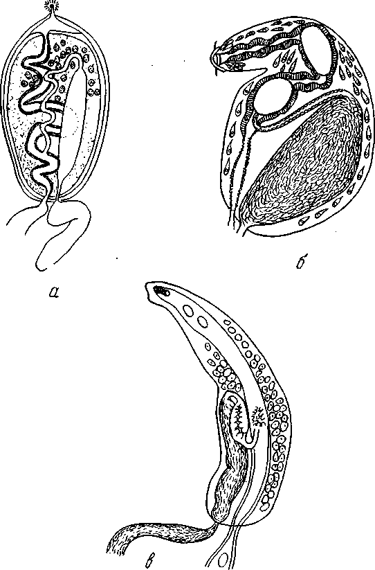 a — Megasolena estrix Linton, 1910 (по Мантеру, (1935); 6 — Carassotrema horeanum Park, 1938 (по Парку, 1938); в—Hapladenaovalis Linton, 1910 (по Мантеру, 1947)