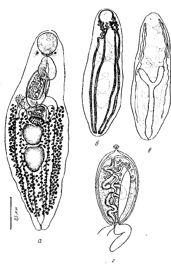 a— марита; б — лимфатическая система; в — экскреторная система; е — гермафродитная бурса