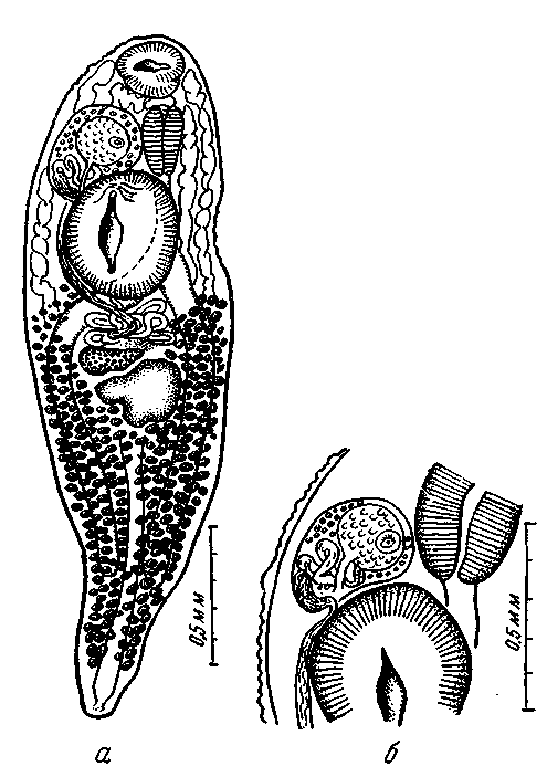 Имеется большой семяприемник, который располагается главным образом вентрально перед тельцем Мелиса. Лауреров канал не был обнаружен. Желточники очень обильны и распределяются периферически по всему телу. Петли матки лежат между яичником и брюшной присоской. Имеется явно выраженное экскреторное отверстие в заднем конце тела и прямой экскреторный сосуд.