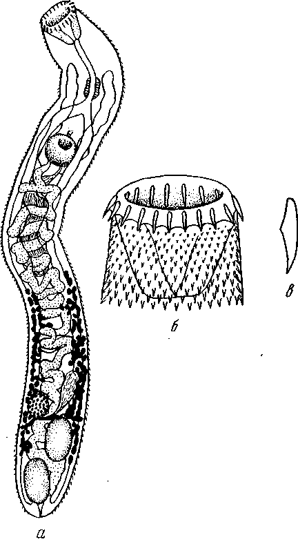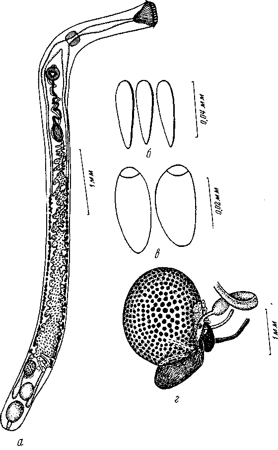 a — марита; 6 — головные шипы; в — яйца; г — комплекс женских половых органов