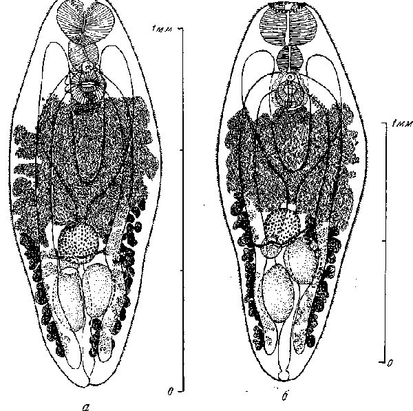 Брюшная присоска почти наполовину меньше ротовой и расположена у начала второй пятой части длины тела; ее размеры 0,102— 0,115 X 0,100—0,140 мм. Префаринкс отсутствует; фаринкс более или менее шаровидный; обычно длина его превышает ширину, 0,094—0,137 X 0,086 — 0-, 135 мм. Пищевод отсутствует; кишечные стволы оканчиваются приблизительно на расстоянии 0,1 мм кпереди от заднего конца тела. Экскреторный пузырь Y-образный, состоит из длинного медианного ствола и довольно широких ветвей, достигающих уровня переднего края фаринкса.