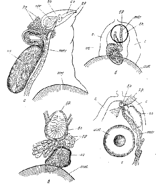 acet. — брюшная присоска; g. p. — половое отверстие; d. e. — семяизвергательный протон; d, h. — гермафродитный проток; metr. — метраметрм; ph. — фаринкс; p. p. — простатическая часть; v. pr. — простатический пузырек; v. а. — семенной пузырек; ul. — матка; v. h. —гермафродитный пузырек