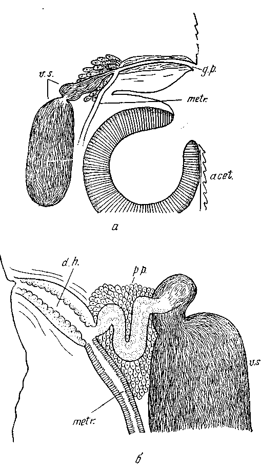 a — Brychyphallus crenatus (Rudolphi, 1802) (По Однеру, 1005); б — Synaptobothrium caudiporum (Rudolphi, 1819) (по Лооссу, 1908) acet.— брюшная присоска; g. p.— половое отверстие; d. h.— гермафродитный проток; metr.— метратерм; p. p.— простатическая часть; v. s.— семенной пузырек