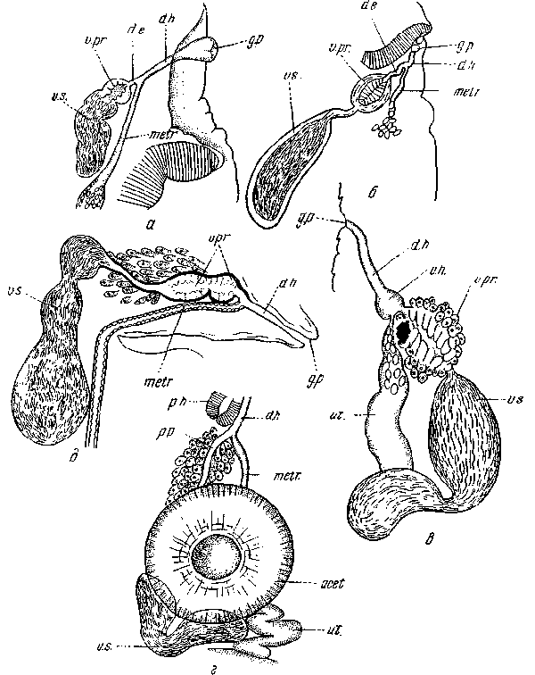 а — Lecithochirium floridense (Manter, 1934) (по Мантеру, 1934); б — Separogermiductus inimlci (Yamaguti, 1934) (по Ямагути, 1934); в — Dissosaccus laevis (Linton, 1898) (по Мантеру, 1934); г — Ceratotrema jurcolobiata I. Jones, 1933 (по И. Джонсу, 1933); acet.— брюшная присоска; с — кишечник; b. h. — гермафродитная бурса; g. p.— половое отверстие; d. h. — гермафродитный проток; metr. — метратерм; р. р.— простатическая часть; V. pr.—простатический пузырек; v. s.— семенной пузырек
