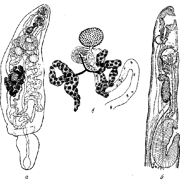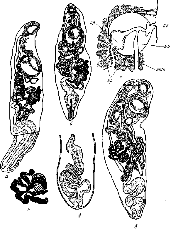 а, б, в — марита; а — яичник и желточники; 9 — хвостовой конец мариты с экскреторным каналом (по Линтону, 1910); е — терминальный участок полового аппарата (по Мантеру, 1934 ив Кроукрофта, 1946) b. h.— гермафродитная бурса; g. p.— половое отверстие; metr.— метратерм; р. р.— простатическая часть; v р.— простатический пузырек