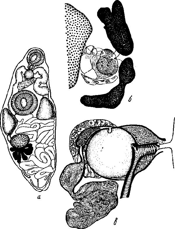 а - марита со втянутым хвостовым придатком, общий вид вентрально; б — шенска: половая система; в — терминальный участок полового аппарата