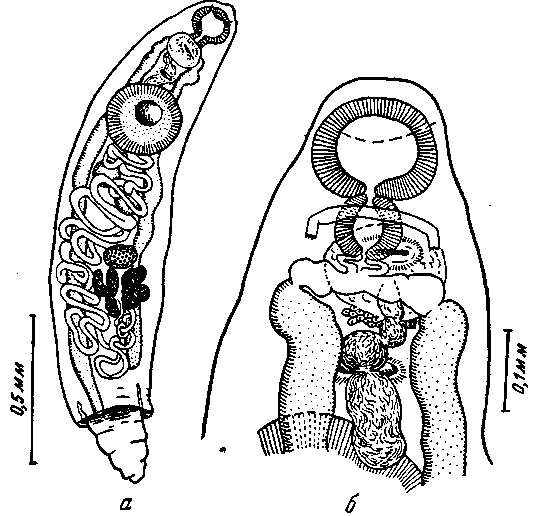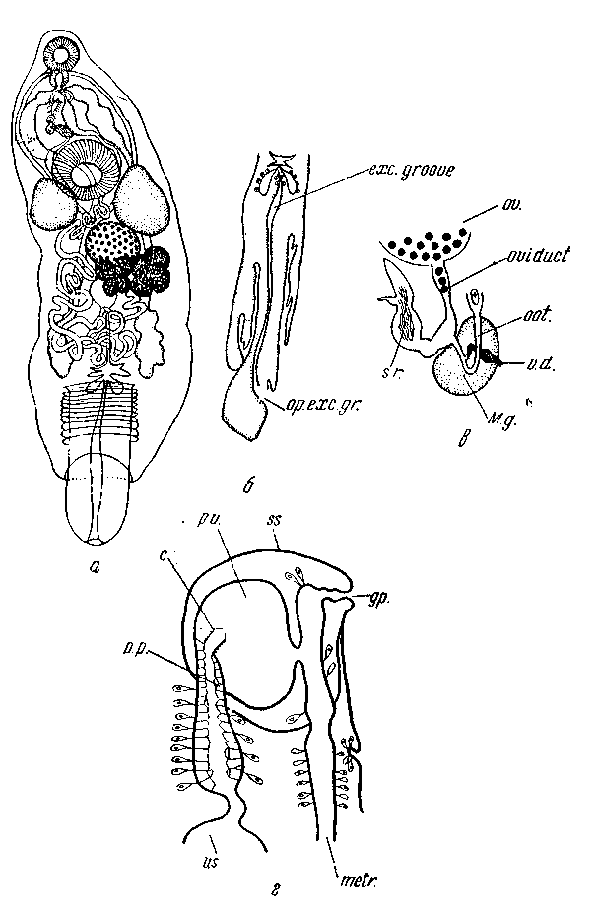 a — марита, общий вид; б—экскреторный желобок; в—часть женской половой системы (по Парку, 1936); г — терминальный участок полового аппарата (по Кроукрофту, 1946); g. p.— половое отверстие; с — «циррус», ехс. groove — экскреторный желобок; p. v. — простатический пузырек; M. d — тельце Мелиса; metr.— метратерм; ор. ехс. gp. — отверстие экскреторного желобка; oot.—оотип; ov.— яичник, oviduct — яйцевод; р. р.— простатическая часть; s. г.—семяприемник; v. d. — желточный проток; v. s.— семенной пузырек