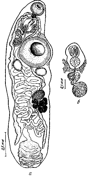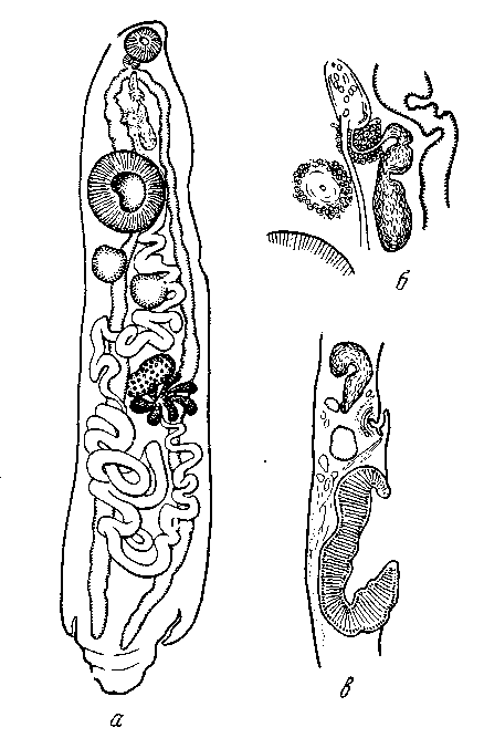 a - марита, общий вид вентрально; б — терминальный участок полового аппарата; в — срез в области брюшной присоски