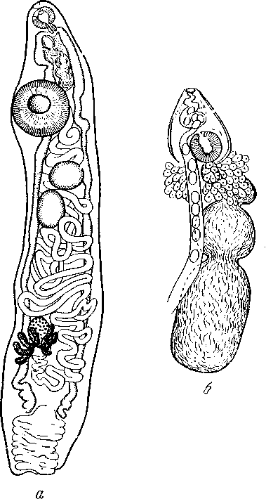 a — марита со втянутым хвостовым придатком, общий вид вентрально; б—терминальный участок полового аппарата.
