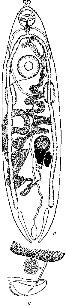 a — марита со втянутым хвостовым придатком, общий вид вентрально; б — яичник с семяприемником и начальной частью матки