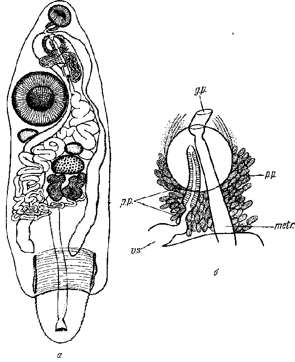 a — марита, общий вид вентрально (по Ямагути, 1938); б —терминальный участок полового аппарата (по Кроукрофту, 1946); g.p.—половое отверстие; metr.— метратерм; р. р.— простатическая часть; v. s.—семенной пузырек