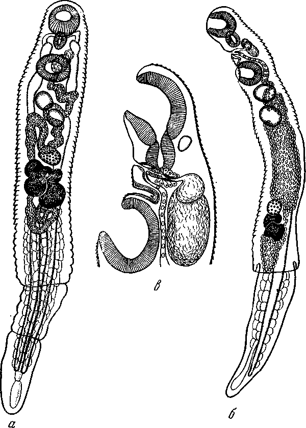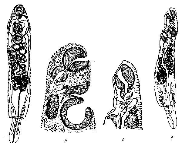 а — марита, общий вид вентрально; б — передний конец мариты (по Однеру, 1905); в — марита, общий вид латерально; г — передний конец мариты (по Лооссу, 1908)