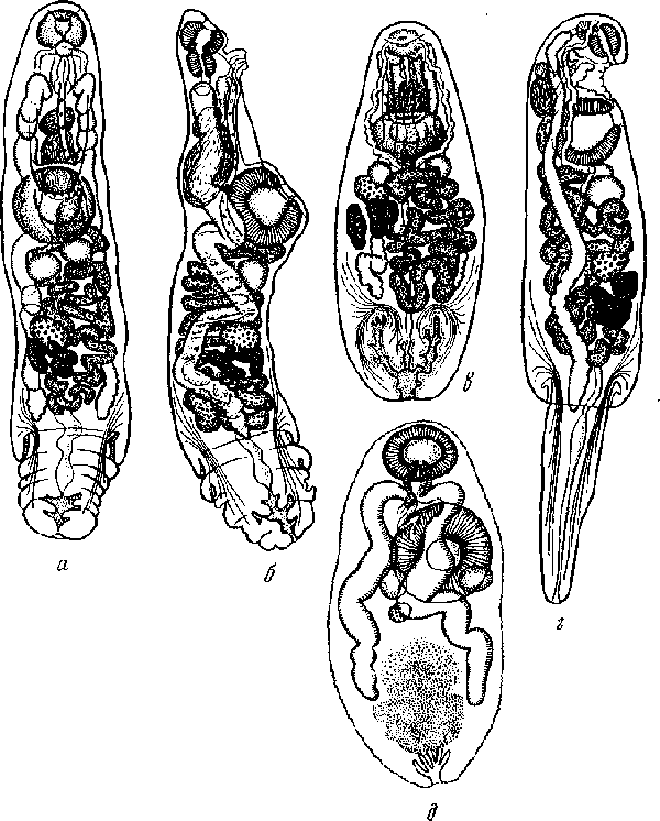 а, б, в — марита со втянутым хвостовым придатком; г — марита о вытянутым хвостовым придатком (по Лооссу, 1908); д — неполовозрелый экземпляр (по Ямагути, 1934)