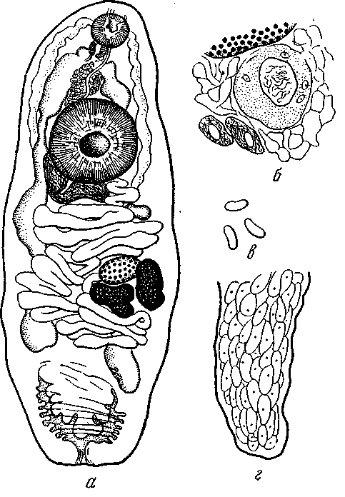 а - марита со втянутым хвостовым придатком, общий вид вентрально; б — срез через тельце Мелиса; в — яйца; е — задний конец мариты с клетками паренхимы