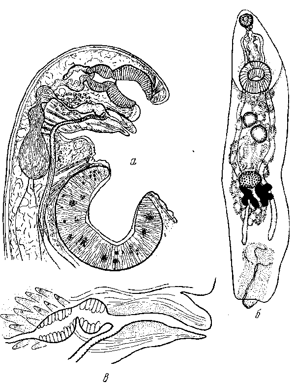 a — срез через передний конец мариты; б — марита, общий вид (по Чендлеру, 1935); в — терминальный участок полового аппарата (по Кроукрофту, 1945)