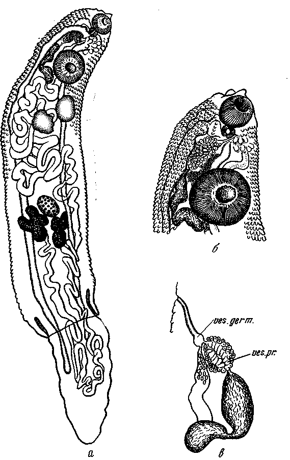 a— марита, общий вид; б — передний конец мариты; в — терминальный участок полового аппарата; ves. germ.— гермафродитный пузырек; ves. pr.—простатический пузырек