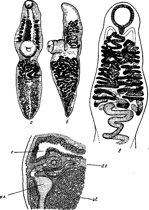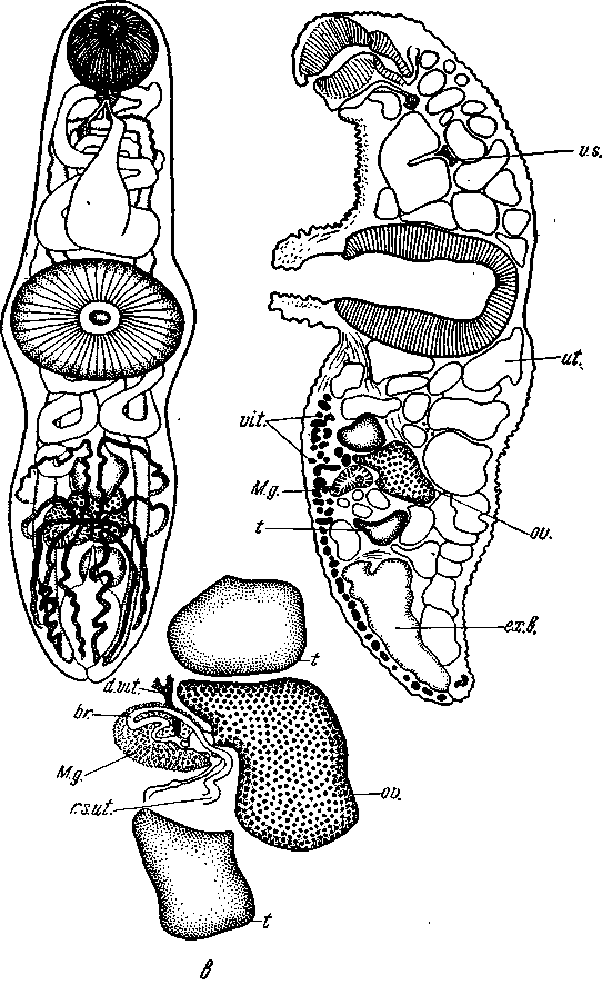 a — марита, общий вид вентрально; б — продольный срез мариты, латерально; в —женская половая система; br.— оотип; d. vit.— желточный проток; ex. b. — экскреторный пузырь; ov.— яичник, r. s. ut.— маточный семяприемник; M. g.— тельце Мелиса; t — семенник; ut.— матка; v. s.— семенной пузырек; vit.— желточннки