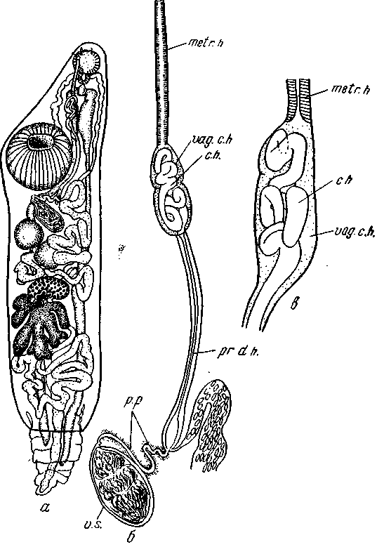 a — марита, общий вид; б — терминальный участок полового аппарата; в — гермафродитный циррус, заключенный во влагалище гермафродитного цирруса; с. h. — гермафродитный цирруе; metr. h.— гермафродитный метратерм; pr. d. h.— проксимальный гермафродитный канал; р. р.— простатическая часть; над. с. h.— влагалище гермафродитного цирруса; V. s.— семенной пузырек