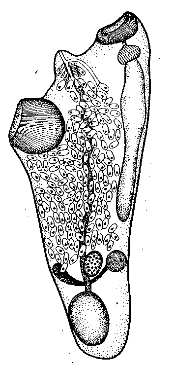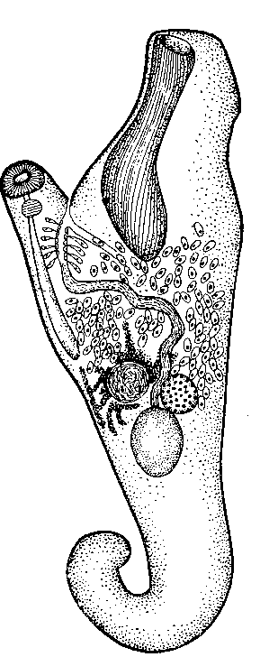 Маленький круглый яичник, 0,18—0,28 мм, лежит наклонно впереди семенника. Размер семяприемника варьирует в зависимости от количества его содержимого; он достигает 0,16—0,4 X 0,2—0,5 мм; несмотря на то, что положение семяприемника тоже варьирует, однако он всегда лежит перед семенником. Небольшой лауреров канал берет начало от притока семяприемника. Тельце Мелиса в виде диффузной железистой массы расположено между семяприемником и яичником. Слабо развитые желточники, состоящие из длинных фолликулов, расположены в пространстве между семенником, яичником, слепым концом кишечника и правой стенкой тела. Запутанные извивы матки расположены в пространстве между семенником и брюшной присоской. Яиц множество; они достигают 0,038—0,04 мм и содержат мирацидиев с выступающими глазными пятнышками. Матка открывается в гермафродитный проток.