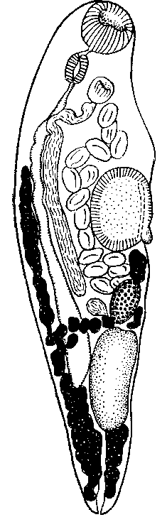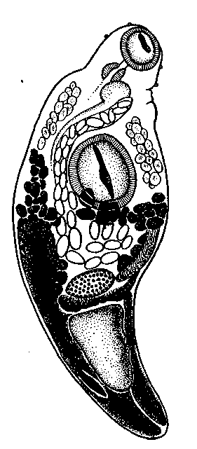 Брюшная присоска крупнее ротовой. Половое отверстие лежит медианно у заднего конца фаринкса.