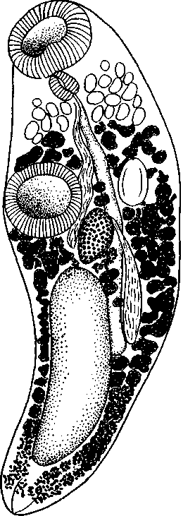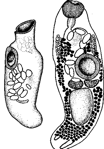 Желточники состоят из крупных фолликулов, имеют тенденцию срастаться в продольном направлении; они тянутся обычно от заднего конца тела до уровня фаринкса; в редких случаях они простираются только до брюшной присоски. Яйца 0,08—0,093 мм длины и 0,044— 0,056 мм ширины. Матка не переходит за уровень расположения семенника. Экскреторное отверстие лежит дорзально и субтерминально; экскреторный пузырь разветвляется на разных уровнях, от места находящегося позади семенника до переднего края последнего. Экскреторные ветви, слегка извитые, достигают передней части тела.